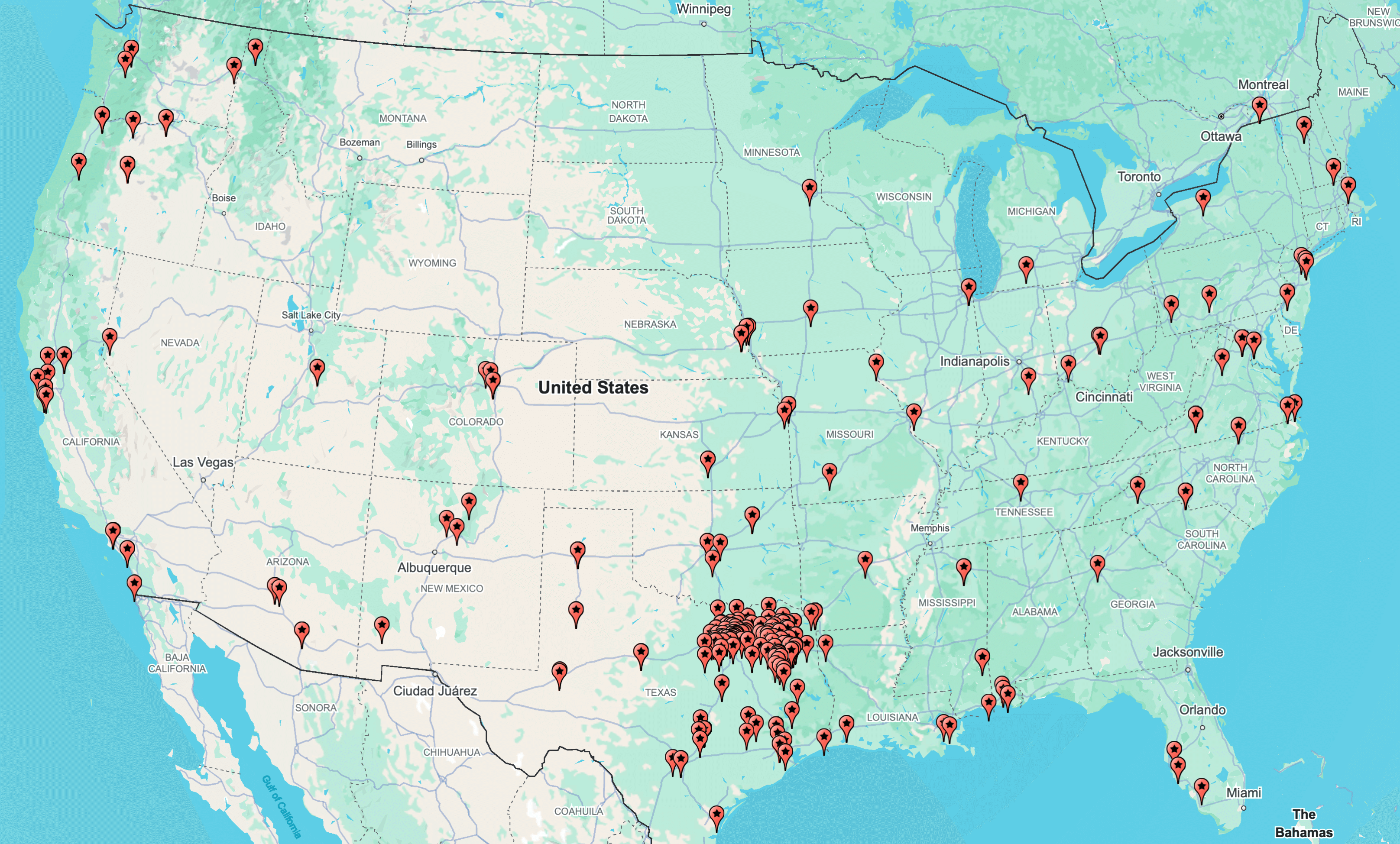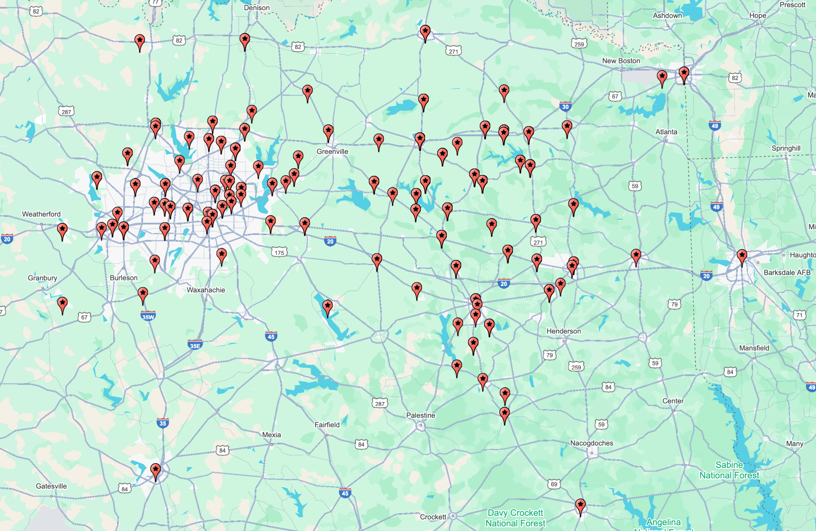 We were curious ourselves so I went to the trouble of geolocating all the unique cities that connected to the Winnsboro News and clicked the view button to see the newspaper. Well, I was as surprised as you might be, so I mapped it so you could see it for yourself. The first picture is a zoom in of our area which is just an unintelligible cluster in the second picture of the whole nation. Each red marker is a city. Some of these cities had thousands of individual locations that read The Winnsboro News. Pretty neat, right? Now scroll down...